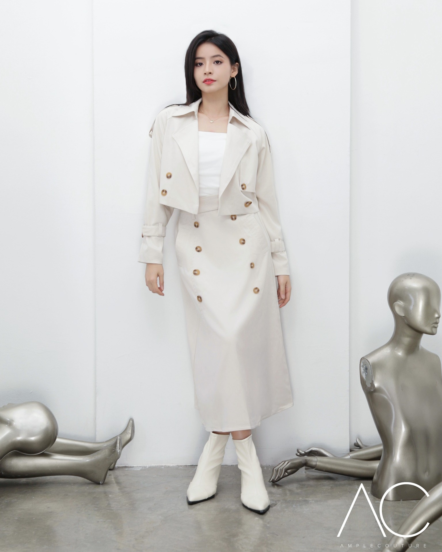 🤎 Cropped trench + high-waisted button-down skirt set