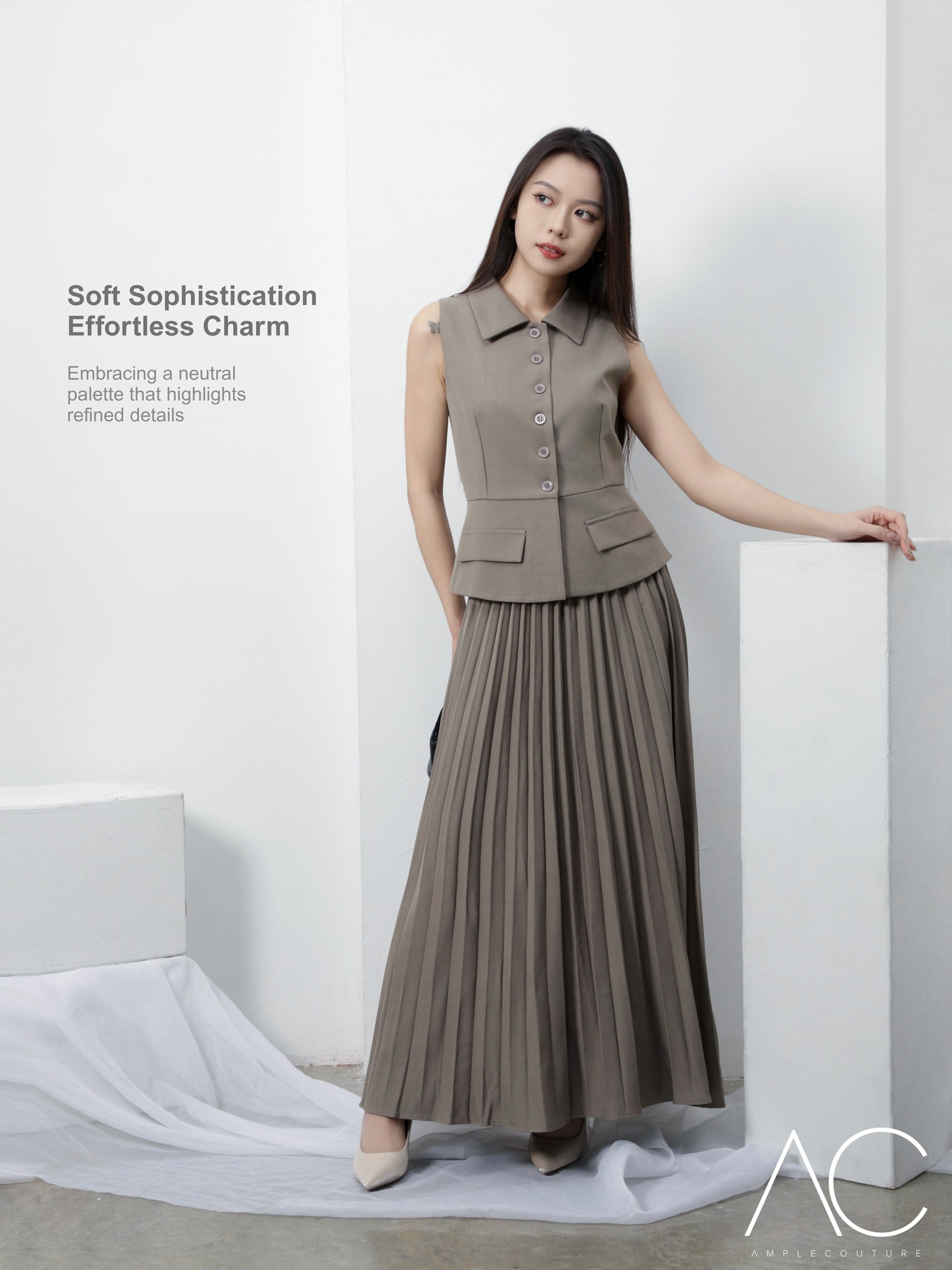 ☕ Structured stand-collar sleeveless top + pleated skirt co-ord